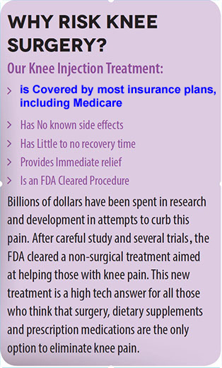 this effective treatment plan with you, face to face, in our office. Please call us today to schedule a consultation with one of our doctors. There is NO COST and NO OBLIGATION for the consultation with the doctor. Our doctors are really interested in listening and understanding what is causing your knee pain and to see if this treatment program can help. And yes: most insurances and MEDICARE will